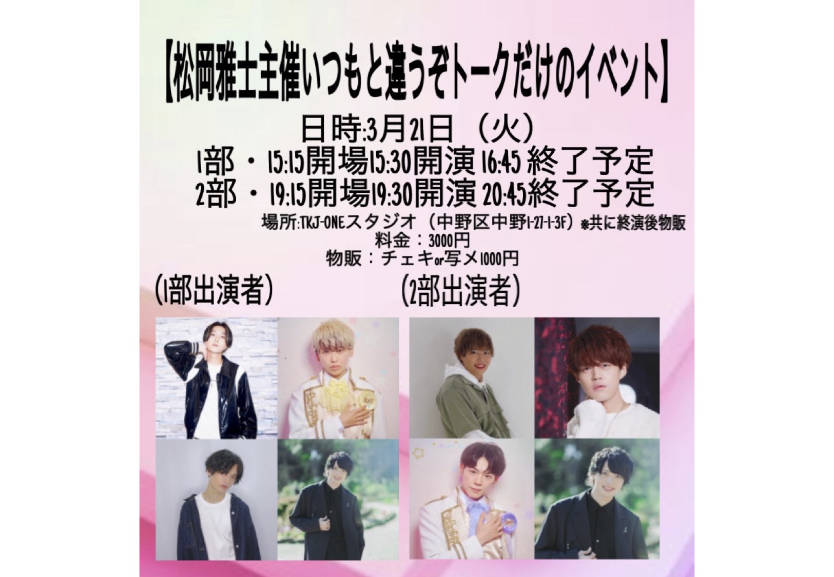 「松岡雅士主催いつもと違うぞトークだけのイベント」 《日時》 2023/3/21(火) 1部 三村杏樹出演 OPEN 15:15 / START 15:30 2部 宮本雪翔出演 OPEN 19:15 / S […]